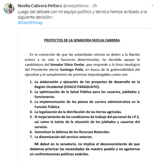 Noelia Cabrera Petters, en su tweet, justifica la postura en su supuesto deseo de priorizar las necesidades del pueblo y evitar «confrontaciones políticas estériles». Además, confirmó que ella y su equipo apoyarán a Ovelar, ya que «responde a la línea ideológica del presidente electo, Santiago Peña».