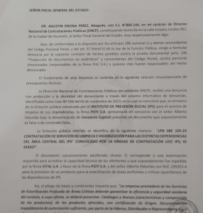 La Dirección Nacional de Contrataciones Públicas (DNCP), a través de su director Agustín Encina Pérez denunció a finales del año pasado ante la Fiscalía General del Estado, a la firma Poti S.A., encabezado por Alberto Palumbo.