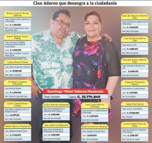 El «clan Adorno», que ha colocado a varios de sus miembros en cargos públicos, desangrando las arcas del Estado por más de G. 2.046 millones anuales, sin que muchos de ellos tengan la preparación necesaria para los puestos que ocupan, lo que ha generado un fuerte impacto en la administración pública así como gran indignación en distintos sectores de la sociedad.