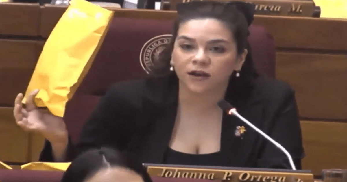 La diputada Johanna Ortega (PPS) llevó sobres de papel al pleno de Diputados en burlesca alusión a los fajos de dólares encontrados en Mburuvicha Róga, caso que derivó en el despido del personal doméstico de la familia presidencial. Acusó un “silencio cómplice” de las instituciones de control ante lo que calificó como abuso de poder del presidente Santiago Peña.